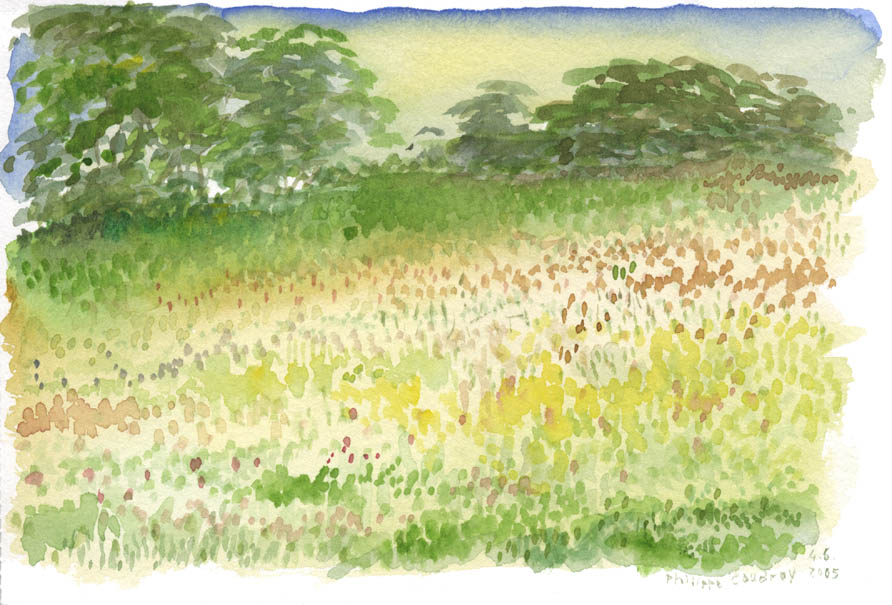 2005 (cliquer pour agrandir) : Retour "Aquarelles présentation" : cliquer ICI Aquarelles vœux 2007 : cliquer ICI Aquarelles mars 2006-2 : cliquer ICI Aquarelles mars 2006 : cliquer ICI Aquarelle "nuit" et sa version "jour" : cliquer ICI Aquarelles "paysages enneigés" : cliquer ICI Aquarelles canards : cliquer ICI Aquarelles 2 : cliquer ICI La prairie en fleurs est un lieu permissif : comme on sait qu’elle sera fauchée, on peut cueillir les fleurs pour faire un bouquet. Les fleurs ont un rôle qui, dans notre société humaine, serait vulgaire : elles montrent leurs organes génitaux pour appâter les insectes. Elles rivalisent de couleurs et de parfums pour attirer ces petites bêtes, comme des panneaux publicitaires. Chez nous, la publicité et l’érotisme se montrent sous des aspects vulgaires, destructeurs de paysages. Les fleurs sont des œuvres d’art. Elles restent discrètent, fragiles, tendres et subtiles. Même si l’art dans la nature est, comme chez nous, détourné à des fins publicitaires (la beauté du paon vante la qualité de ses gênes), il n’est jamais vulgaire. La vulgarité ne séduit pas les animaux sans intelligence. Par contre, ils sont sensibles à l’art. La femelle du paon, aussi stupide soit-elle, reconnaît la beauté du plumage de son futur partenaire, la femelle du rossignol est sensible aux plus beaux chants. Et même la mouche la plus stupide, indifférente à un panneau publicitaire, craque devant une fleur. L’art est universel, la vulgarité ne l’est pas. Il faut être intelligent pour apprécier la vulgarité. Bref : il faut être intelligent pour être bête. |